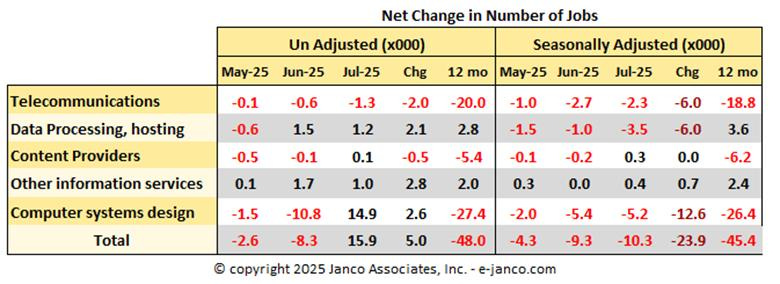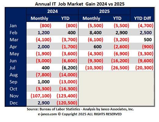 The President said, “According to the latest revised data by the BLS, the IT Job Market shrank by 26,500 YTD. That is after adjusting the May data down by 4,300, June data down by 7,800 jobs, and reporting that 10,300 jobs were lost in July.. That is on top of the adjustments made to May in the June data. Also, deep in their data, the BLS reports there are 244K open IT positions with an unemployment rate of 5.5% for IT Pros.”